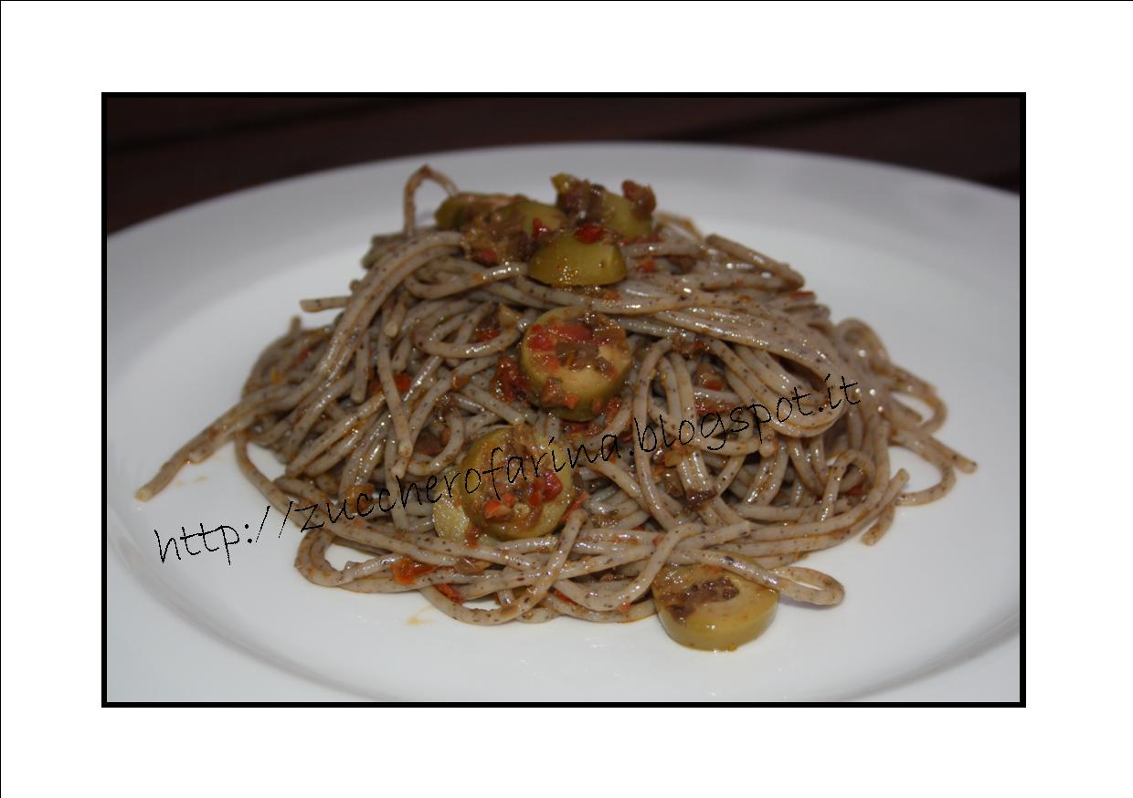 Il grano saraceno mi porta in Valtellina, con il pensiero al freddo e alla montagna e questo sugo cosi profumato e di un rosso così intenso evoca il sole del sud, dei pomodori che maturano sprigionando un profumo irresistibile. L’abbinanamento è curioso ed il tocco in più è l’aggiunta delle olive, quelle grosse marinate della gastronomia ( e non le sottovuoto dello scaffale che scadno tra 2 anni…)
